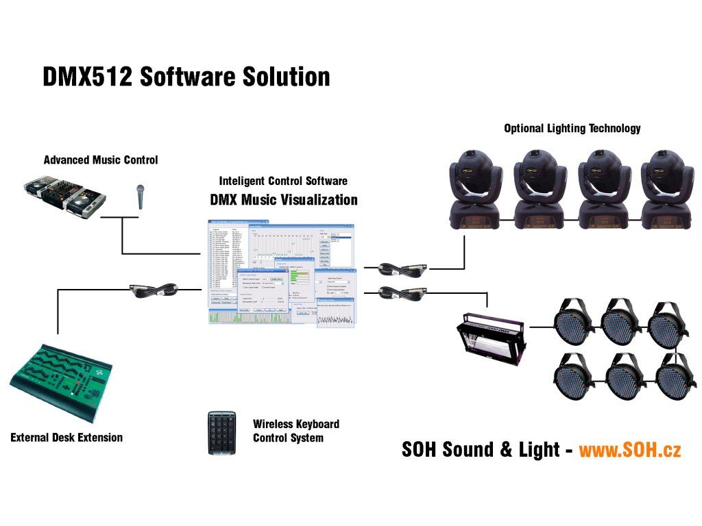 - Umožňuje řídit individuelně každou z desítek světelných jednotek (efektů), na rozdíl od osvětlovače.